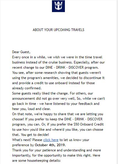 Having sailed with Royal Caribbean before, enjoying every minute of it, and watching what they went through earlier this year with the misprint on their Deluxe Beverage Package, I had high hopes they would do the right thing. Then on Friday, after what I can only imagine was a Tums filled few days for Royal Caribbean employees, another email from Royal Caribbean. The email announced that while they would be discontinuing the program, they were willing to grandfather in those who had already booked with them. Not only did they reinstate the amenity in an effort to not make those happy with the OBC mad, they allowed guests to pick which option they preferred. This was music to my ears. I could retain the amenity I had original booked with and I did not need to make an unnecessary call to Royal Caribbean to fight for the benefit. Crisis Averted!